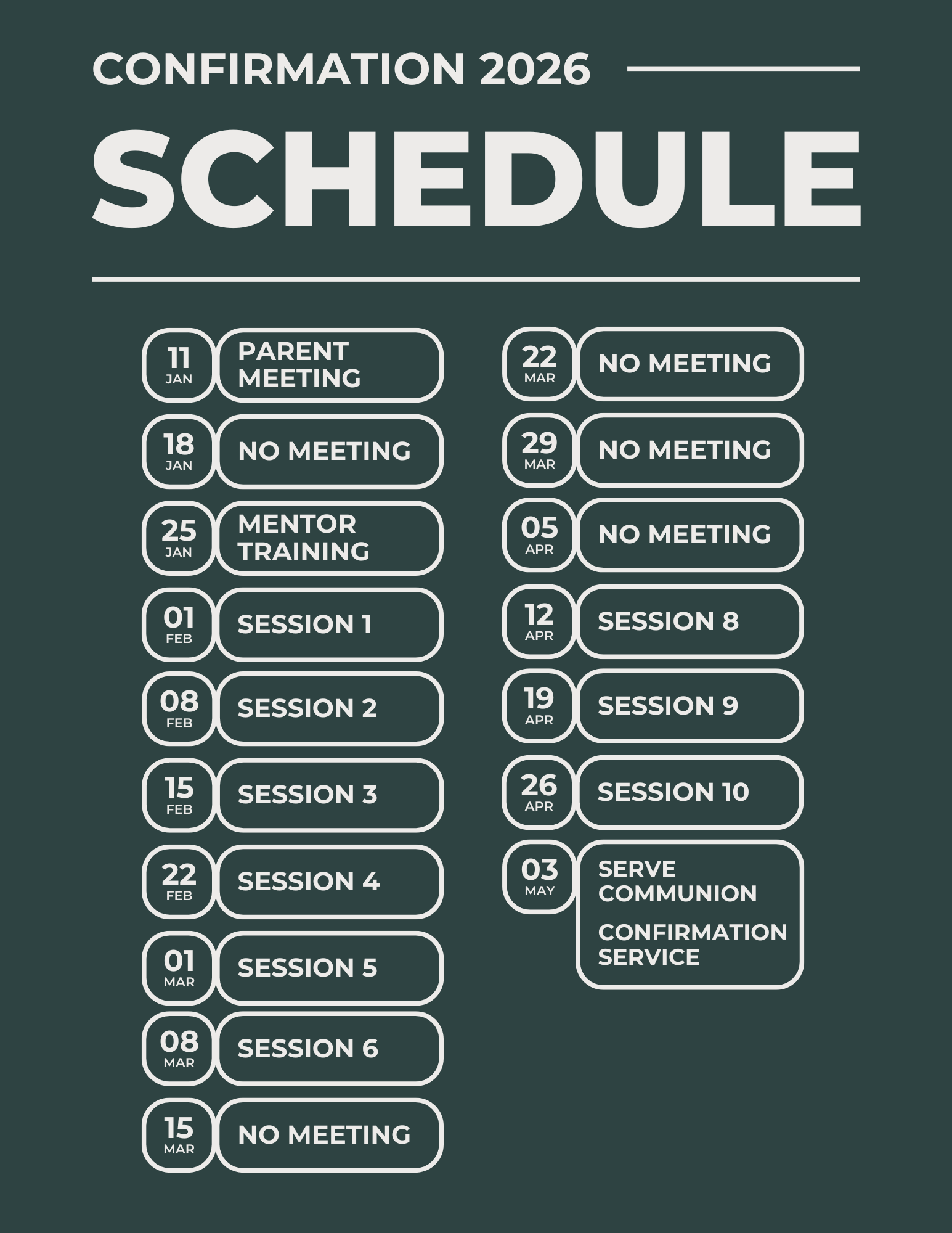 To ensure your student receives the full benefit of the Confirmation program, we ask that they attend all scheduled sessions. If an unavoidable conflict arises, please communicate with us in advance so we can work together to make appropriate arrangements. Thank you for your partnership and commitment to helping your student make the most of this important step in their faith journey.